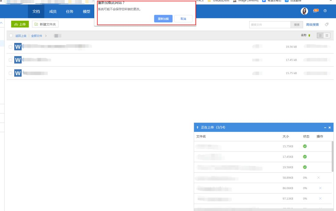3、上传文件过程中,重新加载页面或者切换模块会增加提示信息。