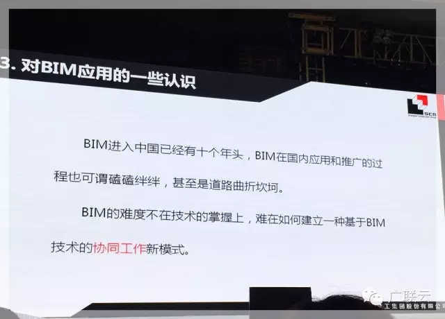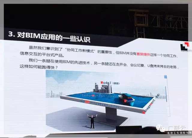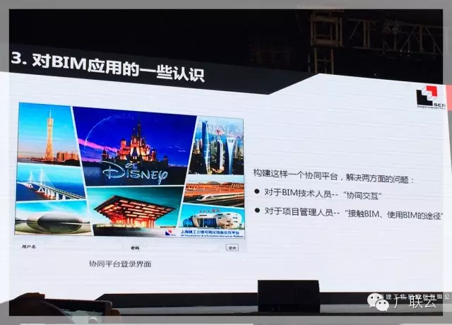 上海建工副总工程师王总在分享了迪士尼项目在可视化、深化设计综合、辅助施工及三维扫描、4D模拟及进度优化、材料采购管理及物流追踪,工程量统计及成本分析,基于BIM技术的信息交互平台,BIM其他技术应用等8个方面的应用之后,也在结尾对于BIM应用的总结思考部分提出了对协同工作、信息交互平台的召唤,这个平台要满足的是BIM技术人员的协同交互需求以及项目管理人员接触BIM使用BIM的途径,即一个轻量化的BIM协同平台。
