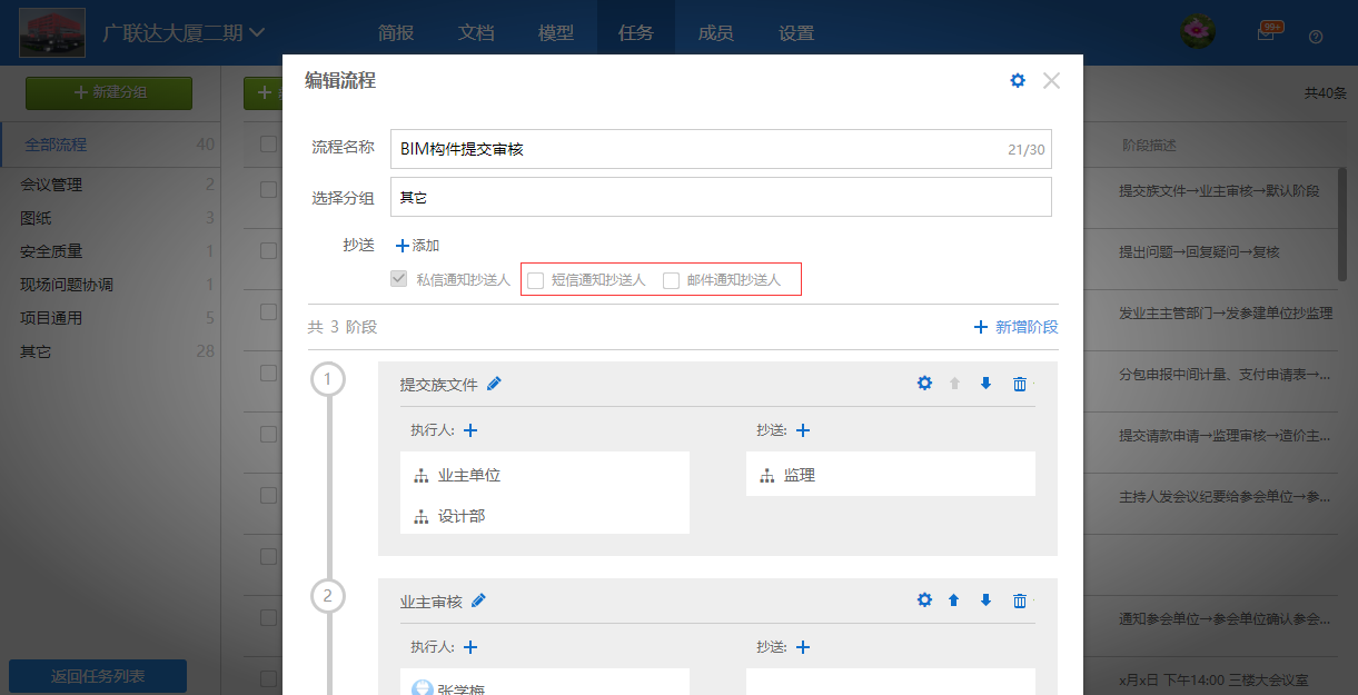 1.4 新增任务根据流程模板设置的抄送人通知渠道对应发送短信、邮件通知功能。