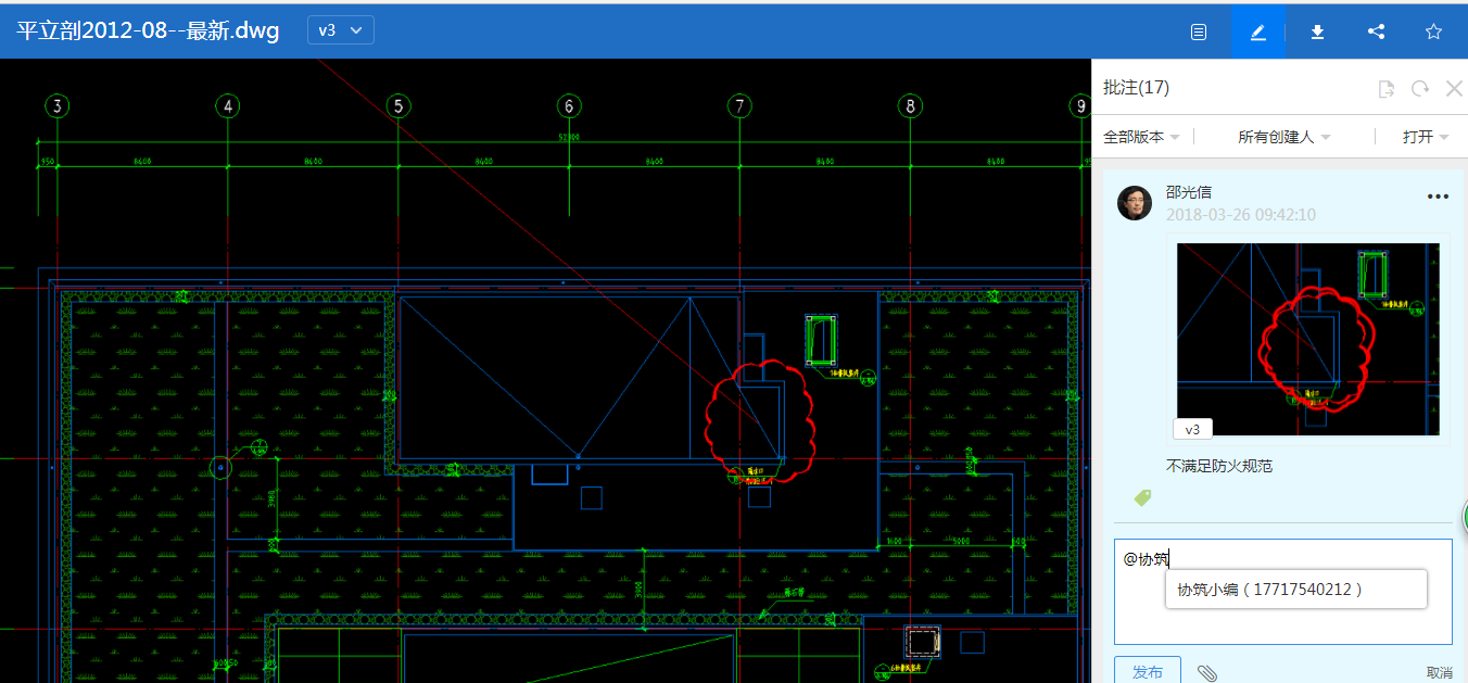 第三类是项目成员之间的交流沟通,涉及到需要发送相关图档作为参考文件的,通过协筑的私信沟通,信息展示更直观。如对图纸有疑义,可以批注后,在评论@相关人员;又如上传了领导分配完成的工作成果文件后,通过私信沟通,领导可第一时间收到短信通知及APP提醒,点击链接,查看文件。